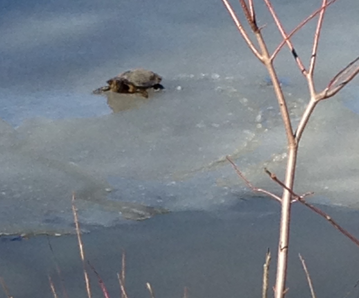 left again through puddle on ice, heading back to water! but left again, his double trail a 9.